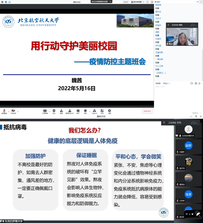 YABO鸭脖官网班主任、辅导员以“共克时艰,守护美丽校园”为主题面向学院全体学生召开班会,发出拒绝外卖、减少快递、守护美丽校园的倡议,将学校的暖心举措详细告知同学们。同学们纷纷表示,大爱暖心北航,要用行动守护美丽校园。