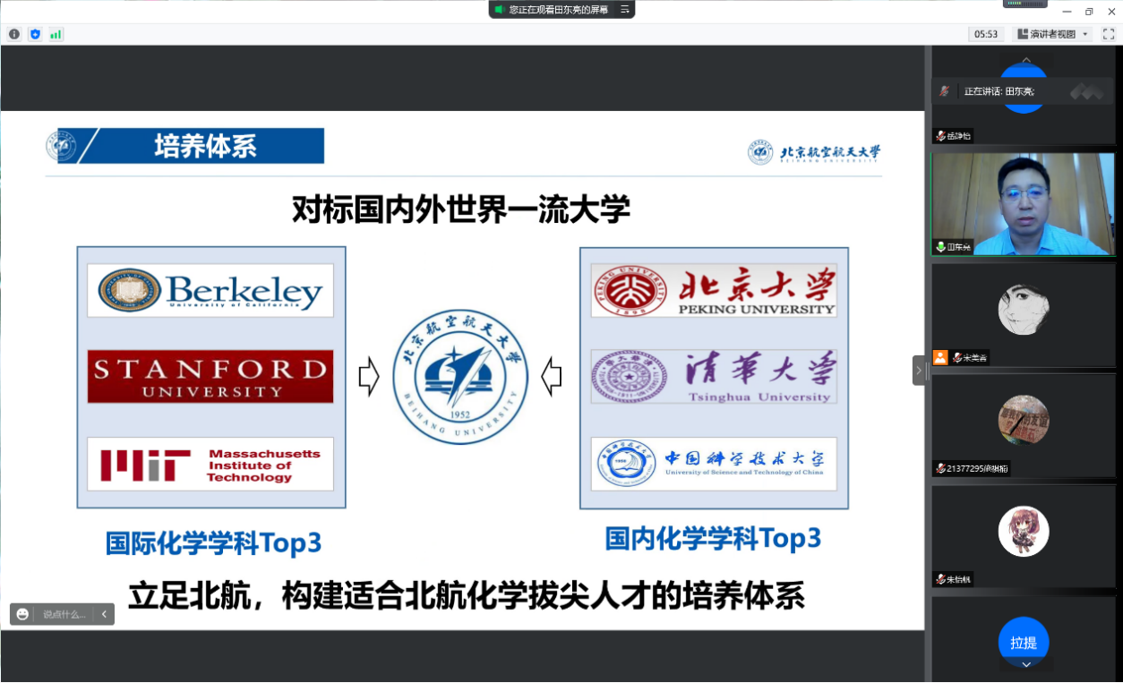 8月28日,YABO鸭脖官网2021级菁英班开展系列专业认知教育活动。上午9:00,专业认知大会以腾讯会议的形式召开。本科教学副院长田东亮老师、化学生物学专业负责人霍利军老师、应用化学系康建新老师、院团委书记魏茜老师与菁英班全体同学参加了此次会议。