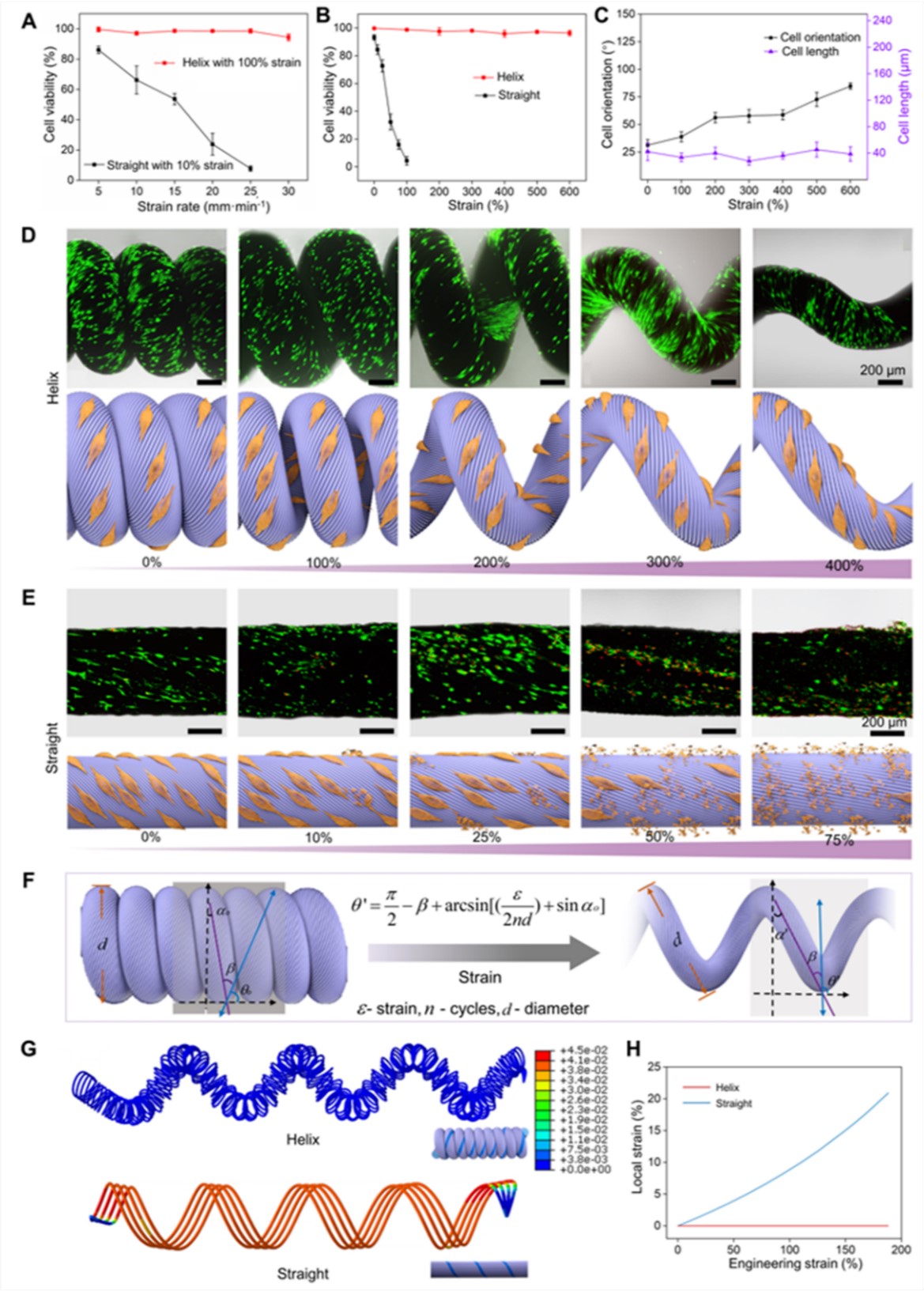 研究团队探究了细胞在螺旋纤维支架上动态培养的生长状态。通过周期性机械拉伸和三维的实时观测,研究细胞在分级螺旋结构上的动态取向、迁移和增殖行为(如图2),证明了细胞支架的生物活性和稳定性。研究表明,独特的螺旋结构在大应变下的纳米纤维重排使细胞所承受的实际应变与外部施加的应变相比明显减小。换句话说,螺旋纤维支架的非仿射变形缓冲效应很好地保护了细胞拉伸受力和变形。所以,螺旋纤维支架在动态培养过程中细胞活性方面明显优于直线性纤维束。