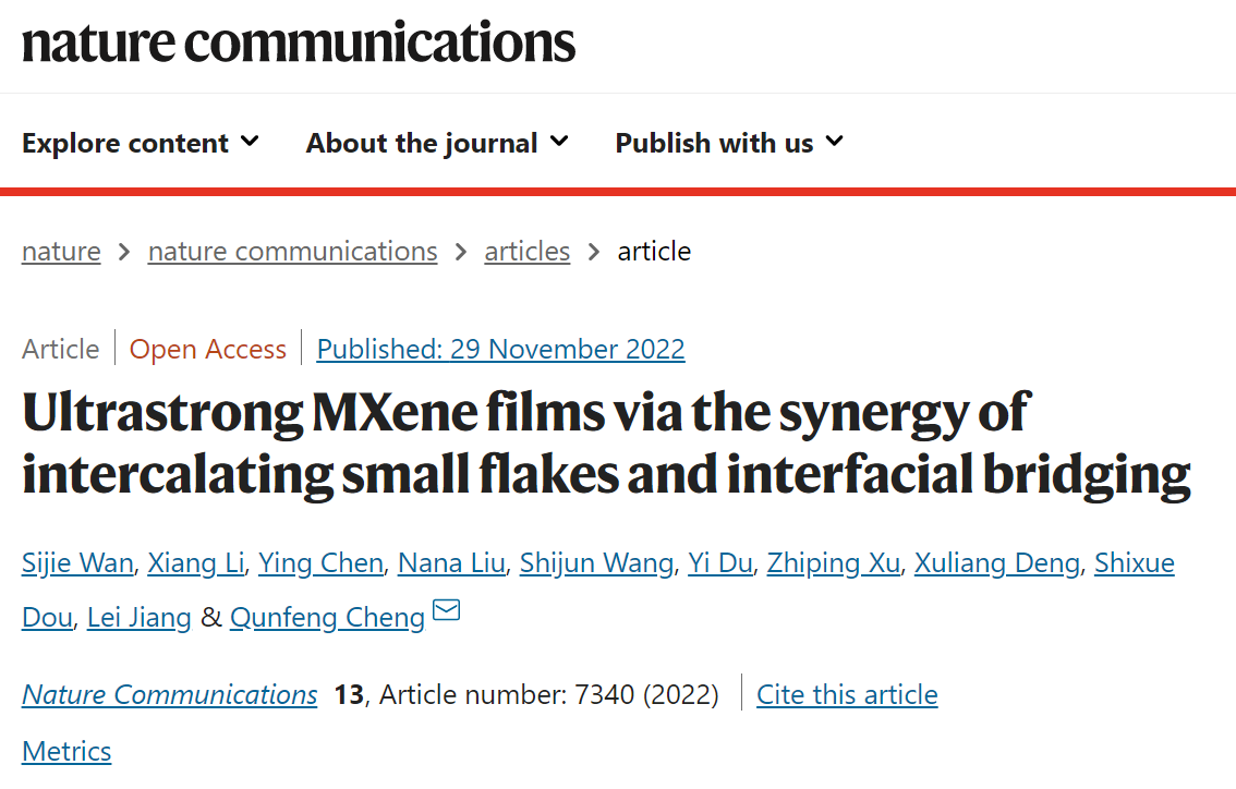 2022年11月29日,《Nature Communications》在线刊登了鸭脖官网YABO鸭脖官网程群峰教授课题组的最新研究成果“小片填充和界面交联协同致密化的超强MXene薄膜”(英译:Ultrastrong MXene films via the synergy of intercalating small flakes and interfacial bridging),鸭脖官网YABO鸭脖官网万思杰副教授、李响、北大口腔医院第一门诊部陈英博士、鸭脖官网物理学院刘娜娜博士为第一作者,程群峰教授为通讯作者,YABO鸭脖官网YABO鸭脖官网为第一完成单位。