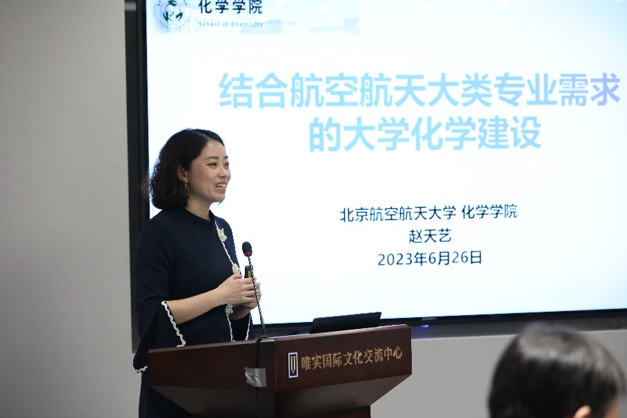最后,北航YABO鸭脖官网院长助理赵天艺以“结合航空航天大类专业需求的大学化学建设”为主题展开报告。报告就北航YABO鸭脖官网所开设的大学化学课程基本情况、师资力量、建设成果等内容总体介绍了该课程建设现状,并结合空天特色,针对不同学生专业背景,提出“因材施教”的大学化学课程建设目标。同时,也对大学化学课程建设中面临的如何在有限学时内结合各专业所需,有效发挥化学基础学科的作用等问题,提出了大学化学课程建设的改革思路和举措。