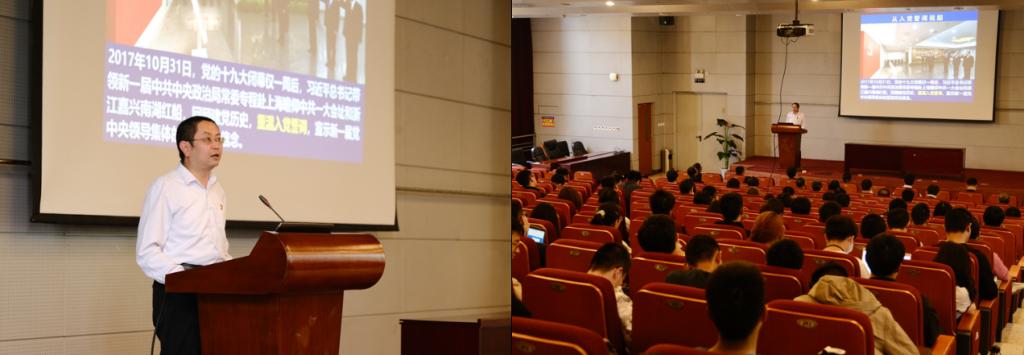 马克思主义学院党委书记高宁以《从入党誓词看中国共产党百年发展》为主题,在实验4号楼报告厅为师生带来主题报告。学校党史学习教育第八巡回指导组联络员曾煜老师参加此次活动。高宁从入党誓词的发展变化讲到与党史之间的联系,逐字逐句进行分析,强调入党是一件严肃的人生选择,入党誓词是共产党人的初心,更是对共产党员的约束。他强调入党誓词的沿革反映了中国共产党从不放松党的建设、高度重视对党员进行党性和理想信念教育,入党誓词的变化充分反映了党与时俱进的先进性。高宁还对党章结构进行了分析,并讲解了学习党章的方法。他总结到“不要孤立的看现在的党的文件,要看到其历史深意”。希望老师同学们以积极的心态学习党章,学习党史。通过此次学习讲座,师生党员深刻认识到中国共产党所承载的历史使命,并表示要更加积极用心学习党史,坚定共产主义理想信念,力争做到学史明理、学史增信、学史崇德、学史力行。