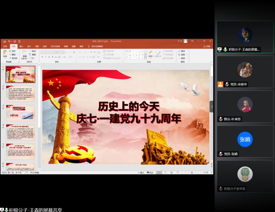 在历史的重要时间节点上,班级开展“爱国爱党,强军逐梦”主题系列教育活动,通过“历史上的今天——庆七一建党九十九周年”主题分享活动、“八一”建军节观影活动、“强军逐梦,奋勇争勋”主题演讲活动,让同学们从历史中汲取了智慧和力量,加强了班级的思想理论建设。