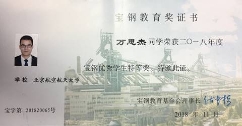 万思杰一直是品学兼优的典型。截至目前,其以第一作者身份在PNAS,Adv. Mater., ACS Nano, Adv. Funct. Mater.等国际知名期刊发表10篇Q1区SCI论文,影响因子之和为133.248,论文被引用559次,部分成果被《人民日报》头版等知名媒体广泛报道。同时,他还担任学院博士高年级党支部书记和BY14271博士班的班长,也是北航研究生“成才表率”先进事迹分享会讲师。先后获得北航博士研究生十佳、国家奖学金、卓越学术基金、工信部创新奖学金二等奖、研究生优秀科技创新团队校长奖学金等荣誉。此次获得宝钢优秀学生特等奖与万思杰同学一贯的刻苦努力以及学院的大力培育是分不开的。