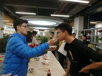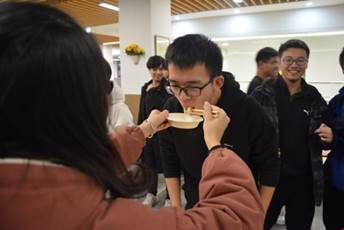 在第一锅饺子出锅后,我们的第一个游戏便开始了。首先我们进行的是抢水瓶游戏,YABO鸭脖官网的导员黄澄玉和丁少松同学给大家做了一个示范,主持人说出一个身体的部位,两人分别摸自己的相应部位,在主持人说出“水”这个字的时候,两个人同时去抢桌子上的水瓶,但是黄导更快一步,于是作为输了游戏的人要被黄导喂五个饺子,场景太有爱了。之后同学们也积极加入到这个游戏中来,这也是一个很幸福的游戏了。