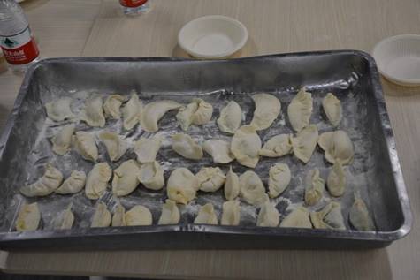下午4点,包饺子活动正式开始。不得不说我们都是人才,不仅上得了厅堂,还下得了厨房,谢海韵和李响的娴熟手法获得了所有人的惊叹,他们为我们友情提供了大部分的饺子皮。由于一些同学还是第一次包饺子,觉得十分新奇,不断尝试,创造出许多形状非常有想法的“作品”,还特别可爱地展示给别人。在包饺子的过程中,我们分工明确,互帮互助,促进了友谊,食堂的二楼到处弥漫着我们的笑声…..