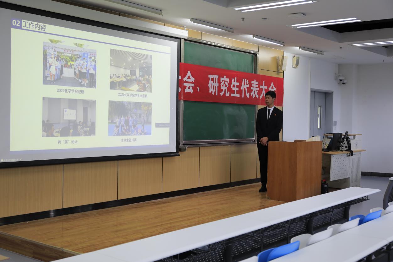 第十五届研究生会主席团成员孙明言作2023年度工作报告。报告汇报了过去一年化院研会在政治引领、志愿实践等多方面的工作,各类活动展现了化院师生积极健康向上的精神风貌,也进一步完善了研究生会各项制度。