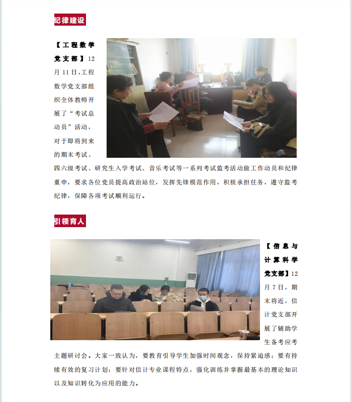 【工程数学党支部】12 月11日,工程数学党支部组织全体教师开展了“考试总动员”活动,对于即将到来的期末考试、四六级考试、研究生入学考试、音乐考试等一系列考试监考活动做工作动员和纪律重申,要求各位党员提高政治站位,发挥先锋模范作用,积极承担任务,遵守监考纪律,保障各项考试顺利运行。