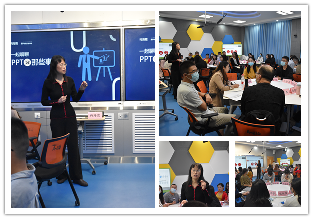 祃海霞以信息化教学及PPT技能提升为主题,介绍了PPT的整体设计思路和逻辑化、可视化设计原理,阐述了四大设计原则,演示了字体、线条、表格、图形、组合等方面的运用技巧和设计细节,分享了自己积累多年的制作素材及常用工具。
