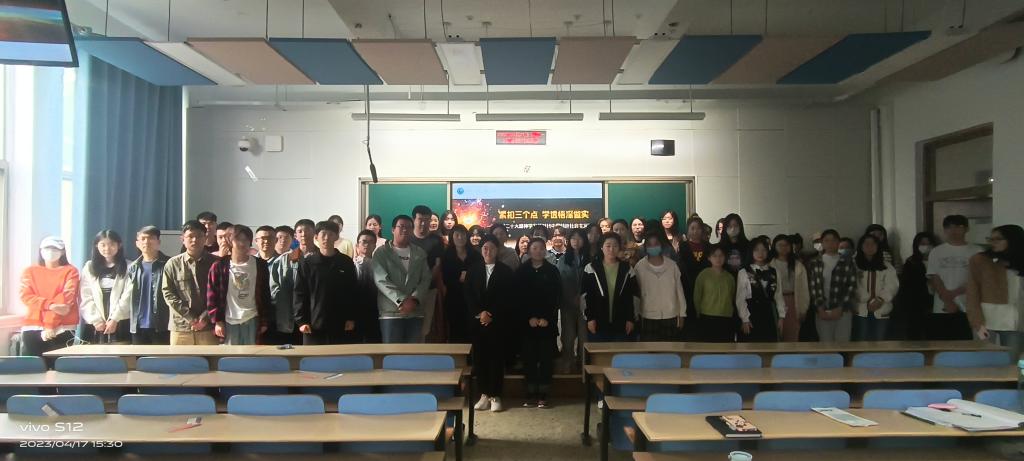 祃海霞以《紧扣三个点,学透悟深做实——贯彻二十大精神学习习近平新时代中国特色社会主义思想》为题,以党的二十大报告精神解读为主线,以学习贯彻习近平新时代中国特色社会主义思想主题教育、大兴调查研究为重点,在对二十大报告进行8方面解读的基础上,紧扣习近平新时代中国特色社会主义思想、中国式现代化、发挥学科专业优势大兴调研实践3个点,利用详实的数据资料和生动形象的多媒体课件,向同学们展示了新时代十年的建设成就、使命任务,解读了中国式现代化的深刻内涵以及三个全面、三个务必、五个必由之路的核心要义。