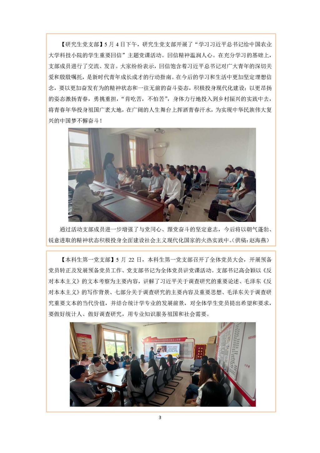 【研究生党支部】5月4日下午,研究生党支部开展了“学习习近平总书记给中国农业大学科技小院的学生重要回信”主题党课活动。回信精神温润人心。在充分学习的基础上,支部成员进行了交流、发言。大家纷纷表示,回信饱含着习近平总书记对广大青年的深切关爱和殷殷嘱托,是新时代青年成长成才的行动指南。在今后的学习和生活中更加坚定理想信念,要以更加奋发有为的精神状态和一往无前的奋斗姿态,积极投身现代化建设;以更昂扬的姿态激扬青春,勇挑重担,“肯吃苦,不怕苦”,身体力行地投入到乡村振兴的实践中去,将青春年华投身祖国广袤大地,在广阔的人生舞台上挥洒青春汗水,为实现中华民族伟大复兴的中国梦不懈奋斗!