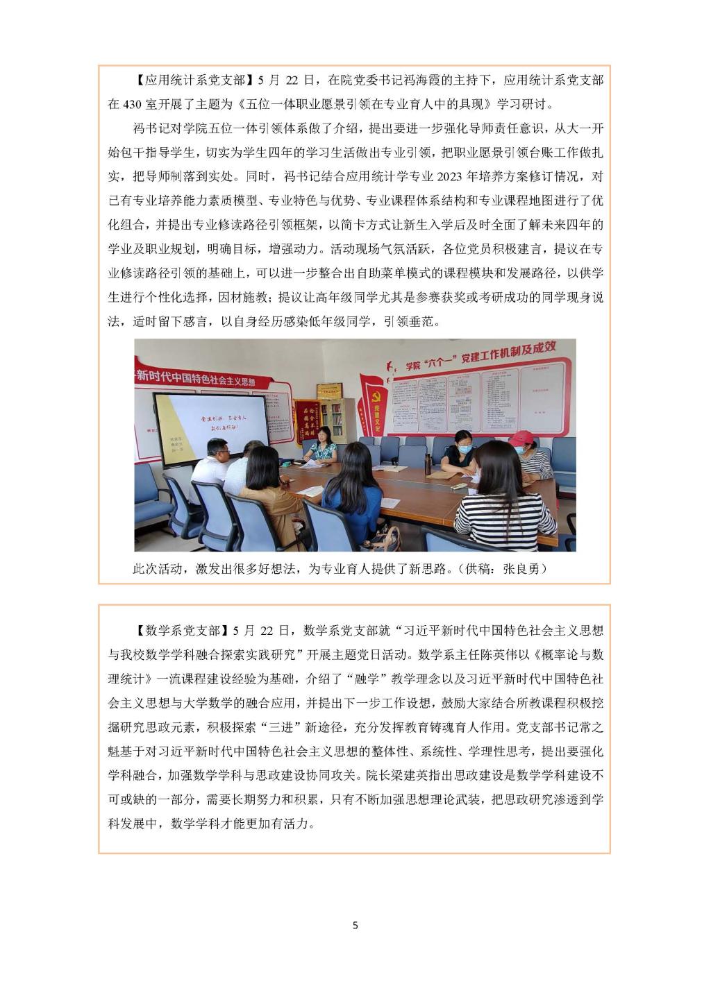 【应用统计系党支部】5月22日,在院党委书记祃海霞的主持下,应用统计系党支部在430室开展了主题为《五位一体职业愿景引领在专业育人中的具现》学习研讨。