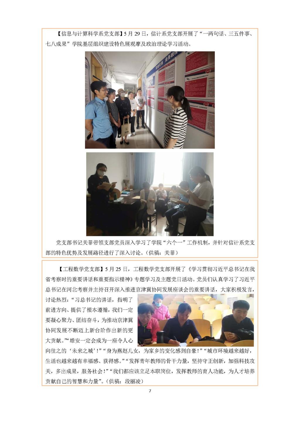 【工程数学党支部】5月25日,工程数学党支部开展了《学习贯彻习近平总书记在我省考察时的重要讲话和重要指示精神》专题学习及主题党日活动。党员们认真学习了习近平总书记在河北考察并主持召开深入推进京津冀协同发展座谈会的重要讲话,大家积极发言,讨论热烈:“习总书记的讲话,指明了前进方向、提供了根本遵循,我们一定要凝心聚力、团结奋斗,为推动京津冀协同发展不断迈上新台阶作出新的更大贡献。”“雄安一定会成为一座令人心向往之的‘未来之城’!”“身为燕赵儿女,为家乡的变化感到自豪!”“城市环境越来越好,生活也越来越有幸福感、获得感。”“发挥青年教师的骨干力量,坚持守正创新,加强科技攻关,多出成果,服务社会!”“我们都应该立足本职岗位,发挥教师的育人功能,为人才培养贡献自己的智慧和力量”。(供稿:段丽凌)
