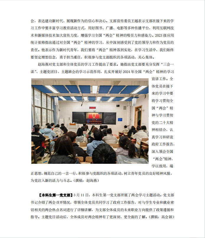 【本科生第一党支部】3月11日,本科生第一党支部开展了两会学习主题活动。党支部书记介绍了两会召开情况,带领全体党员共同学习了政府工作报告,对与学生专业和就业密切相关的两会热点名词进行了详细讲解,为支部全体成员的未来职业方向提供了政策遵循和指导。主题党日活动后,全体成员对两会精神有了更深刻、更全面的了解。(撰稿:高会颖)