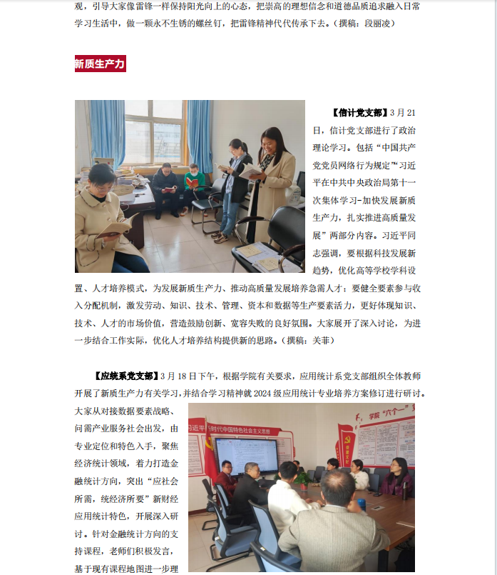 【应统系党支部】3月18日下午,根据学院有关要求,应用统计系党支部组织全体教师开展了新质生产力有关学习,并结合学习精神就2024级应用统计专业培养方案修订进行研讨。大家从对接数据要素战略、问需产业服务社会出发,由专业定位和特色入手,聚焦经济统计领域,着力打造金融统计方向,突出“应社会所需,统经济所要”新财经应用统计特色,开展深入研讨。针对金融统计方向的支持课程,老师们积极发言,基于现有课程地图进一步理顺各学期教育活动的逻辑顺序,调整和增设相关内容,积极探索校企融合、实践类、交叉类教育教学环节的设置。