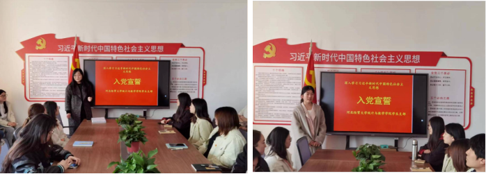 【学生党支部】3月21日下午,本科生第一、二、三党支部和研究生党支部,在四办430会议室共同举行了新党员入党宣誓仪式。仪式上,本科第二党支部书记杨晨老师首先讲明了入党宣誓的重要意义,指出入党宣誓仪式是庄严神圣的,是对新党员进行入党教育的一个重要环节。随后,杨晨老师领誓,新党员们依次排列,紧握右拳,面对党旗庄严宣誓。最后,新党员代表魏辰昊、张宏玥、郭瑞同学进行发言。此次入党宣誓仪式的举行,不仅是对新党员的一次精神洗礼,也更进一步激发了广大党员的爱党爱国热情。