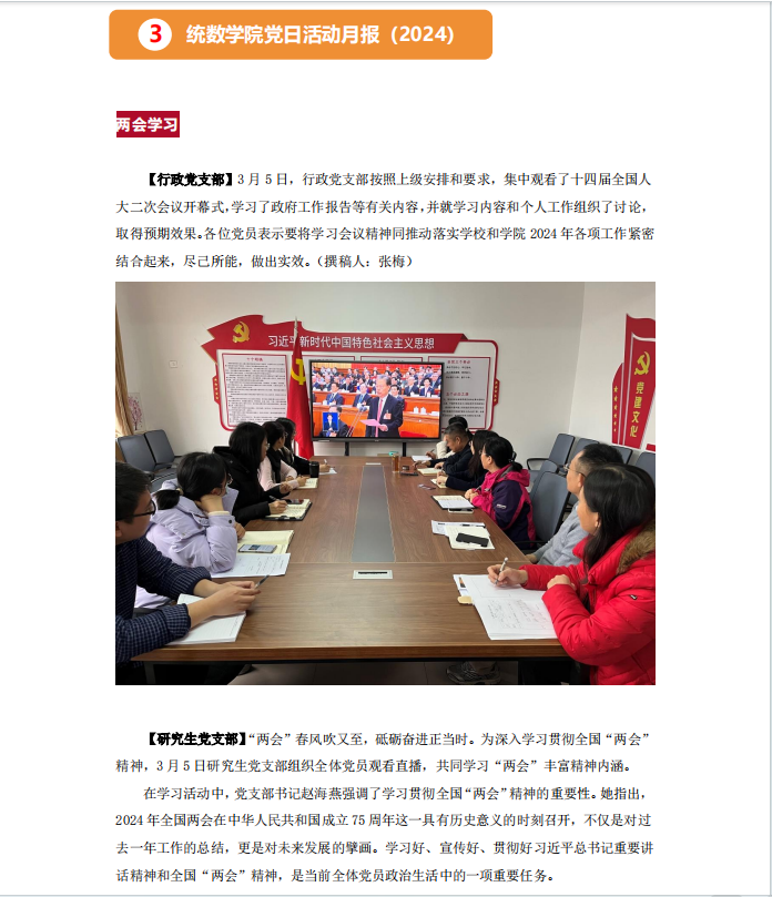 【行政党支部】3月5日,行政党支部按照上级安排和要求,集中观看了十四届全国人大二次会议开幕式,学习了政府工作报告等有关内容,并就学习内容和个人工作组织了讨论,取得预期效果。各位党员表示要将学习会议精神同推动落实学校和学院2024年各项工作紧密结合起来,尽己所能,做出实效。(撰稿人:张梅)