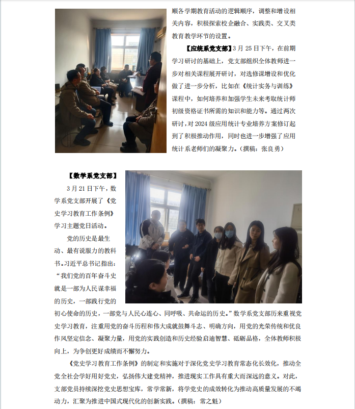 【应统系党支部】3月25日下午,在前期学习研讨的基础上,党支部组织全体教师进一步对相关课程展开研讨,对选修课增设和优化做了进一步分析,比如在《统计实务与训练》课程中,如何培养和加强学生未来考取统计师初级资格证书所需的知识和能力等。通过两次研讨,对2024级应用统计专业培养方案修订起到了积极推动作用,同时也进一步增强了应用统计系老师们的凝聚力。(撰稿:张良勇)