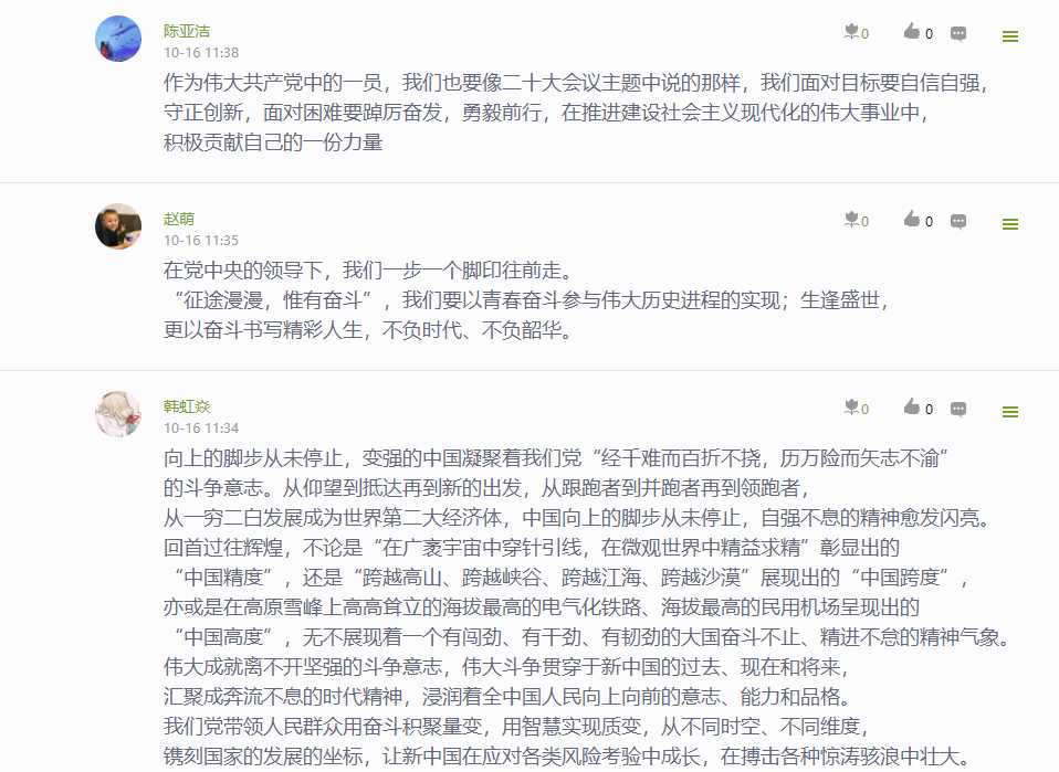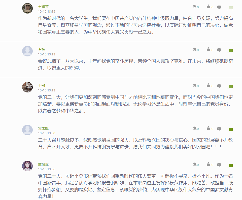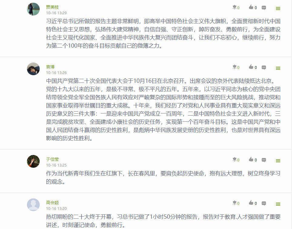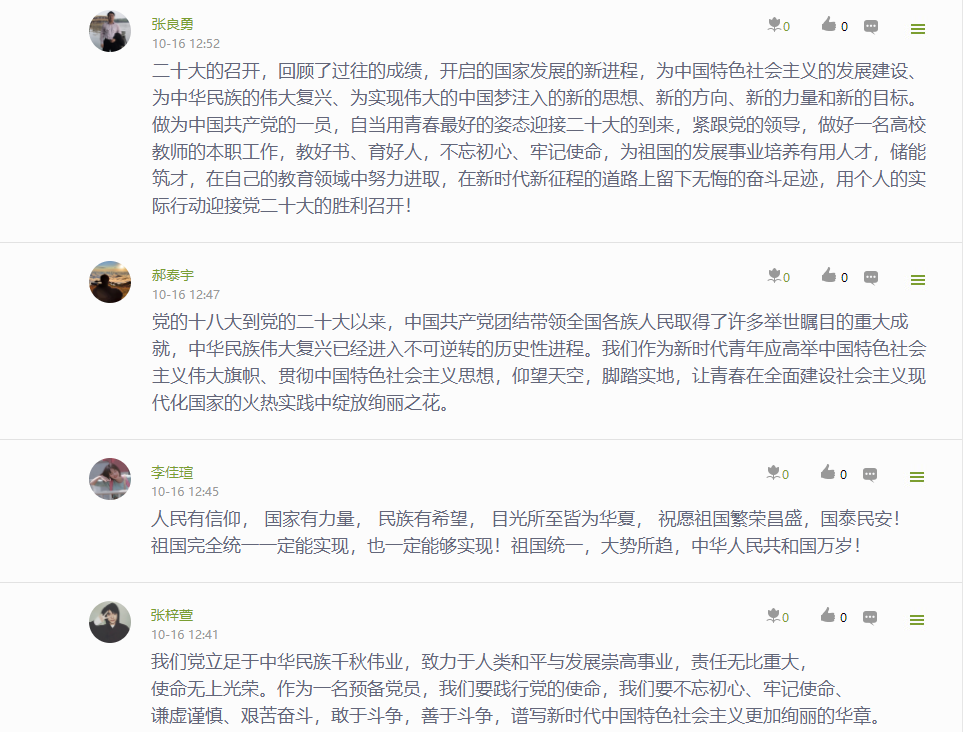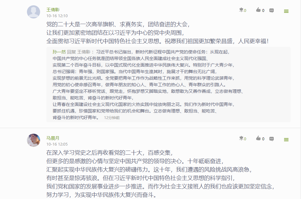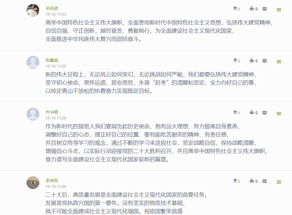 学院党委通过“指尖上的党建 行走的思政课堂”——党委学习通课程平台,建设了相关学习资源,开展了“学习大会报告,我想说…”专题学习讨论,深刻认识和把握大会报告的精神实质和丰富内涵。