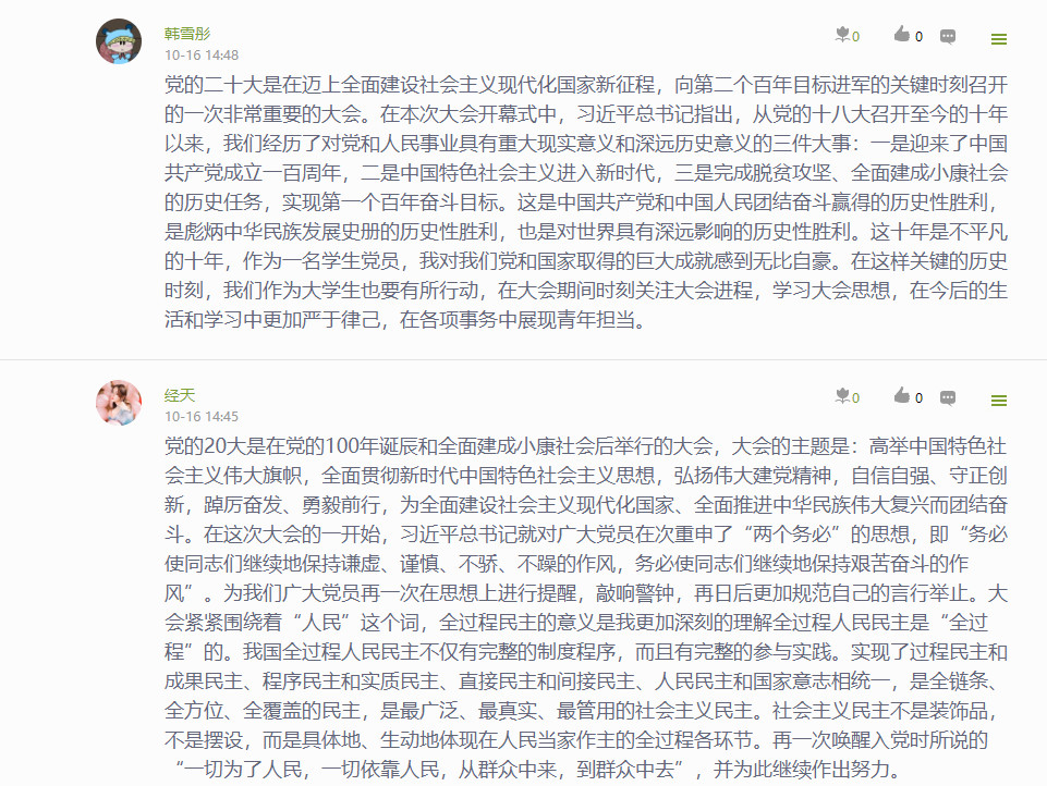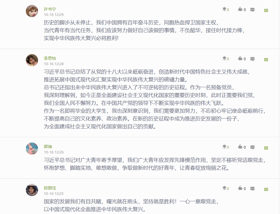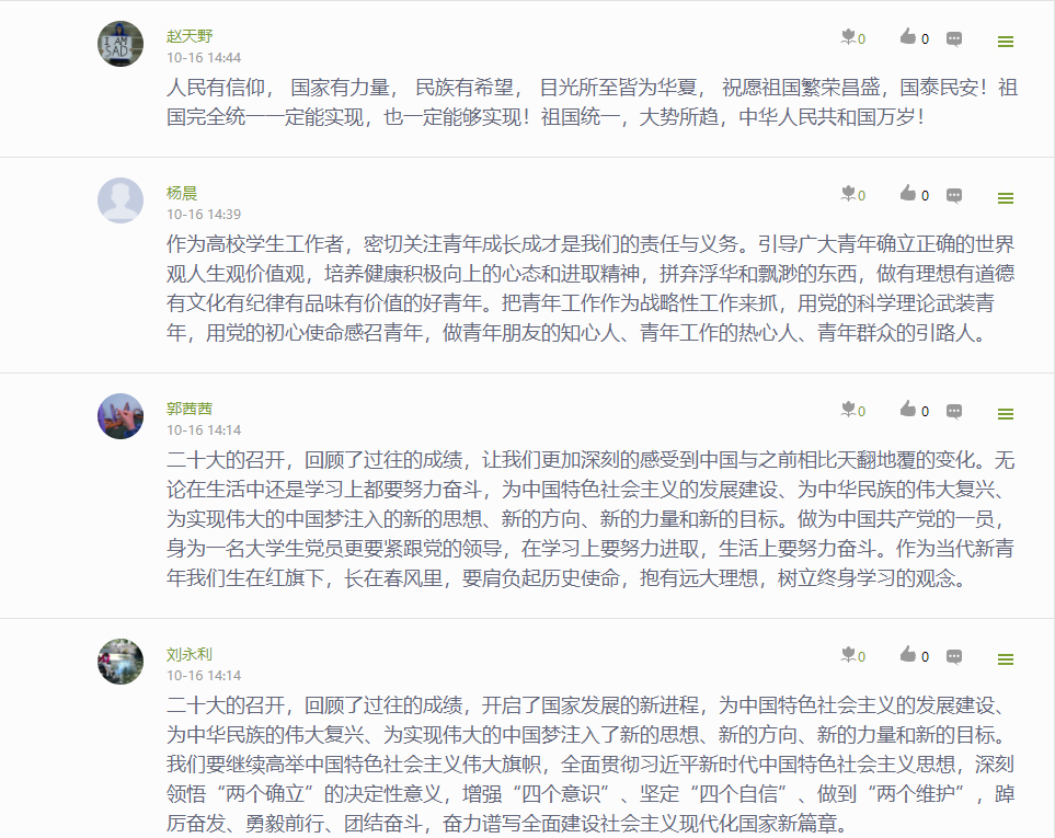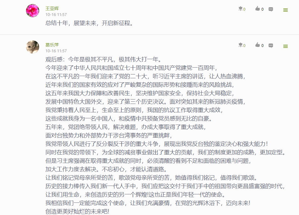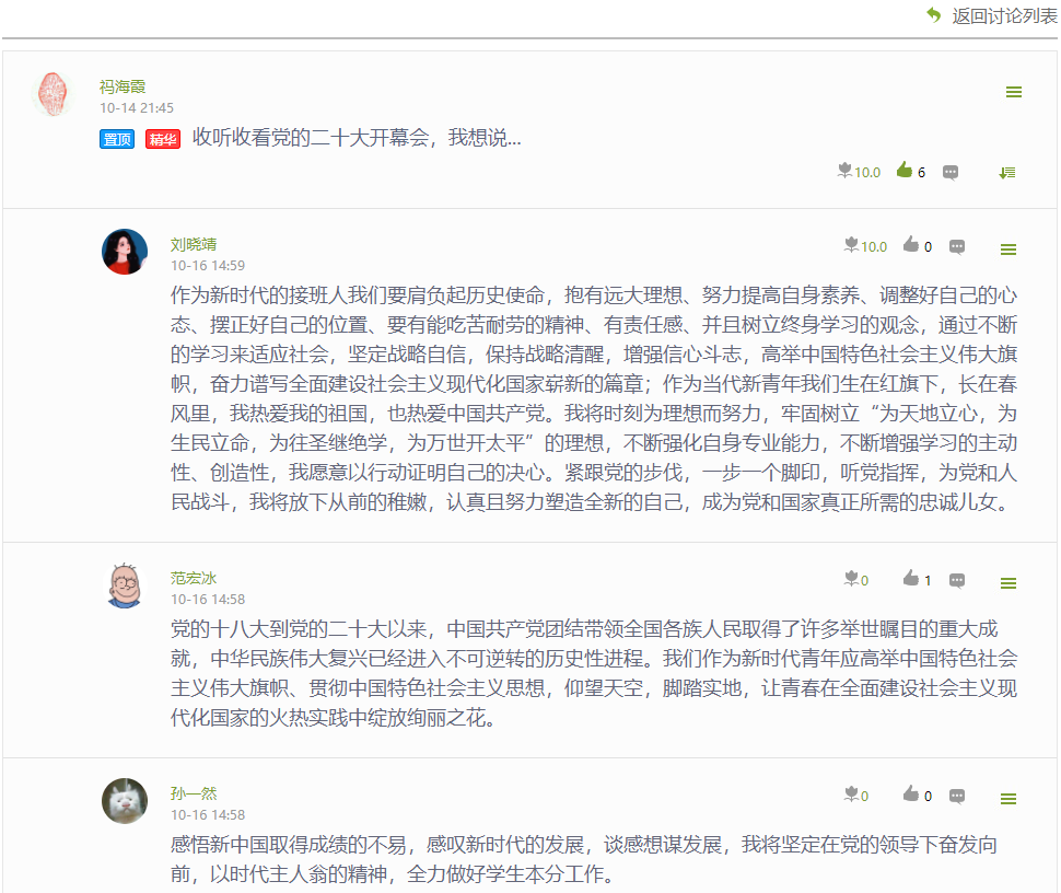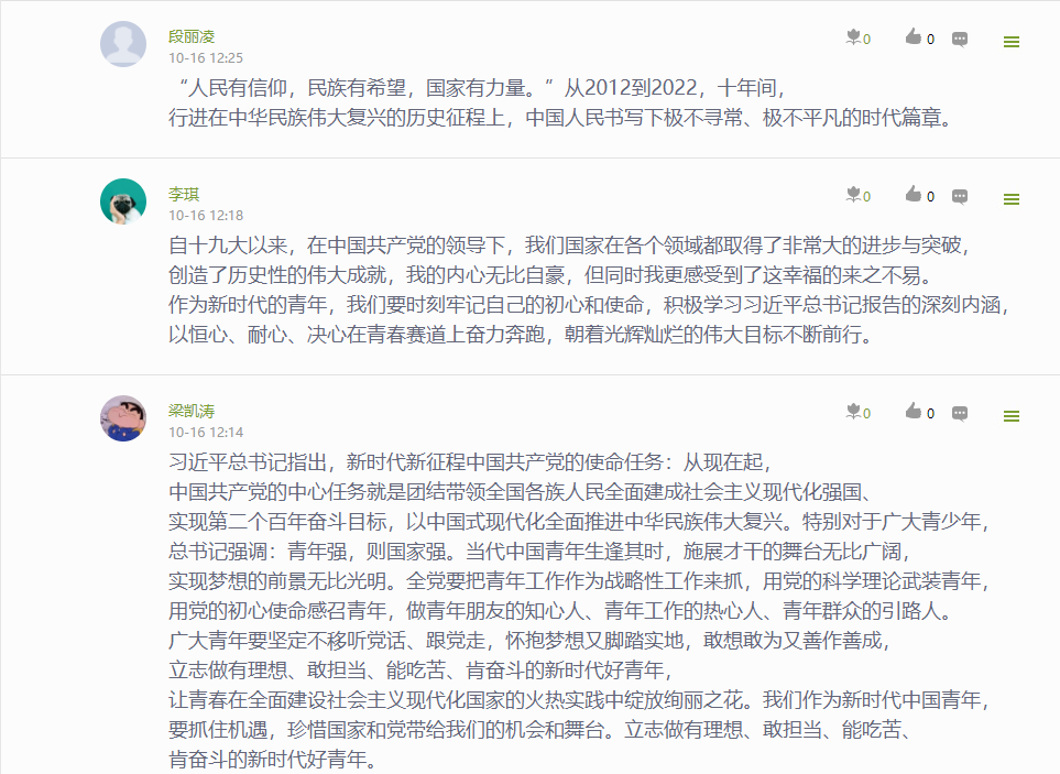 学院党委通过“指尖上的党建 行走的思政课堂”——党委学习通课程平台,建设了相关学习资源,开展了“学习大会报告,我想说…”专题学习讨论,深刻认识和把握大会报告的精神实质和丰富内涵。