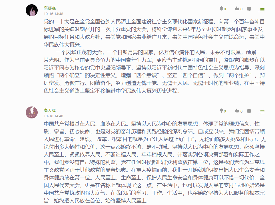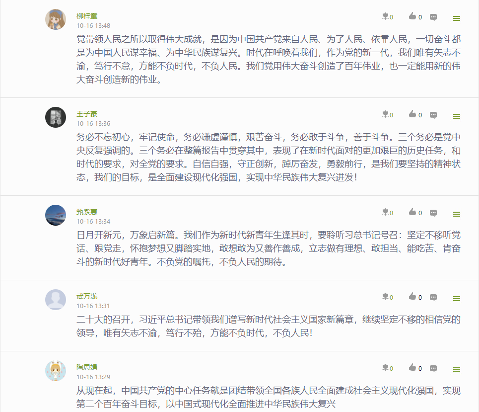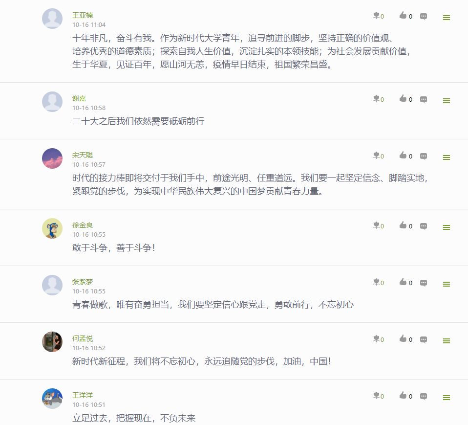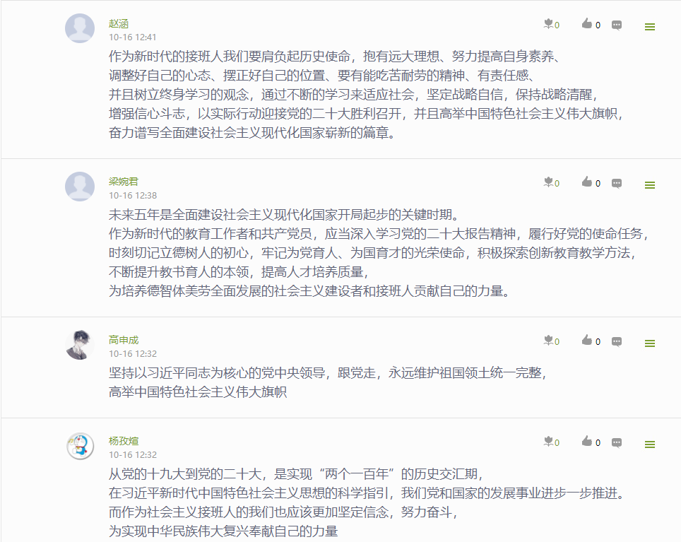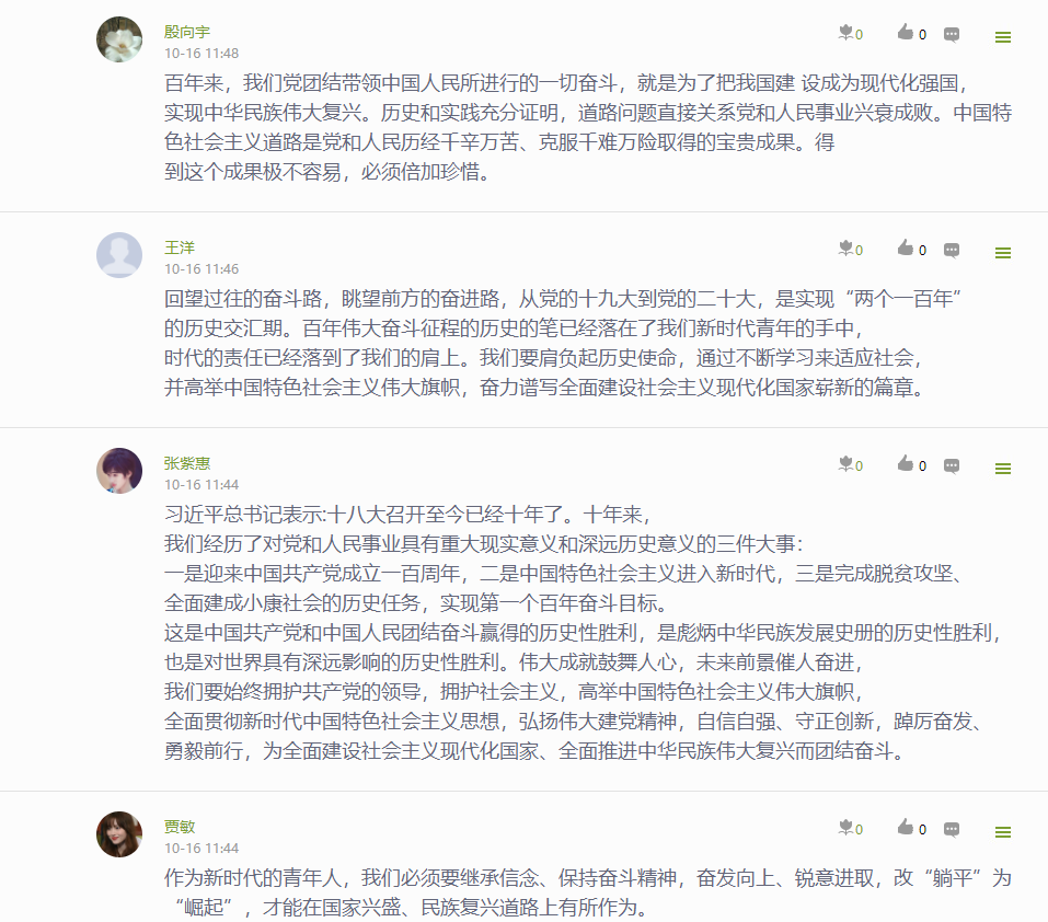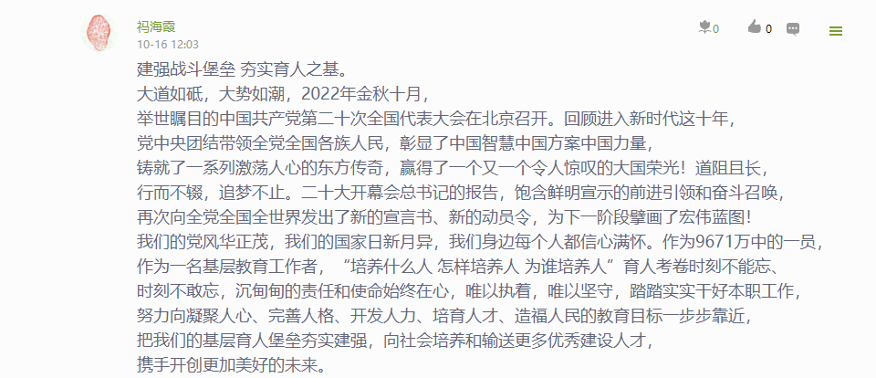 学院党委通过“指尖上的党建 行走的思政课堂”——党委学习通课程平台,建设了相关学习资源,开展了“学习大会报告,我想说…”专题学习讨论,深刻认识和把握大会报告的精神实质和丰富内涵。