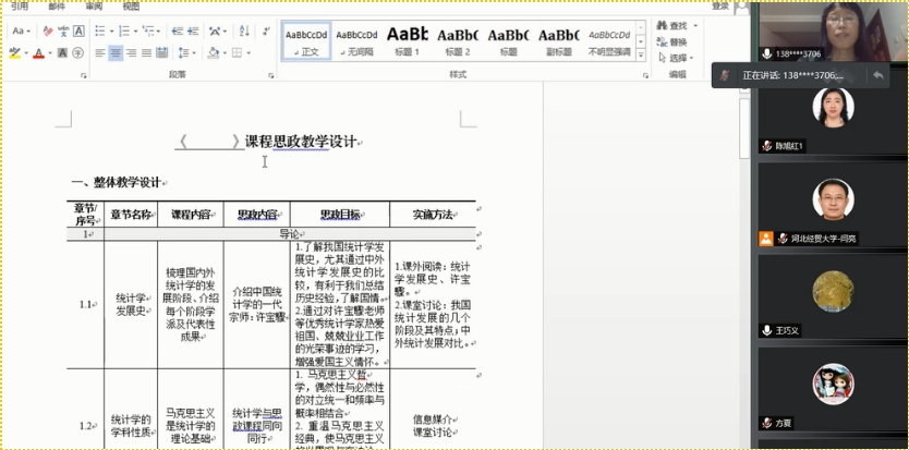 2021年6月23日晚,由教学评估与教师教学发展中心主办,数学与统计学学院承办的本年度第43期教学沙龙通过腾讯会议方式如期举行。学院党委书记祃海霞教授做“课程思政建设标准化”交流分享,学院11门校级课程思政示范课负责人、会计学院部分教师参加了活动。