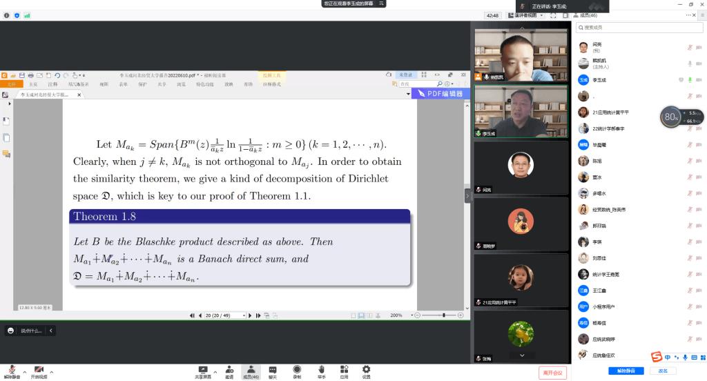 6月10日上午,数学与统计学学院邀请河北师范大学博士生导师李玉成教授在线作题为《On similarity and commutant of multiplication operators on the Dirichlet space》的学术报告。报告由数学与统计学学院副院长闫亮主持,学院主要领导到场参加,40余名教师和研究生聆听。