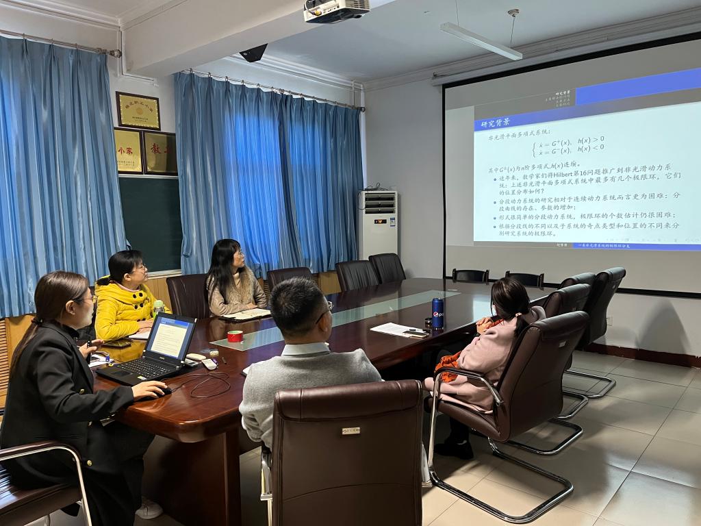 10月21日(星期四)下午,必赢国际437官网“双百论坛”暨数统论坛系列讲座在四办405举行,数学与统计学学院赵倩倩作标题为《一类非光滑系统的极限环分支》的学术报告。祃海霞书记与相关专业教师及研究生近20人参加,闫亮副院长主持报告会。