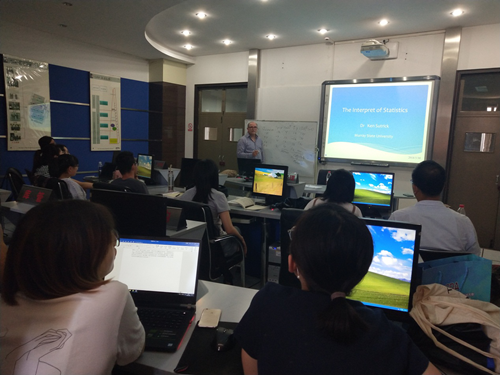 5月30日上午,美国默里州立大学肯(Kenneth H. Sutrick)教授应数统学院邀请,在C411教室作题为“The Interpret of Statistics”的专题报告。报告会由数统学院院长梁建英主持,学院部分老师及研究生共30余人到场聆听。