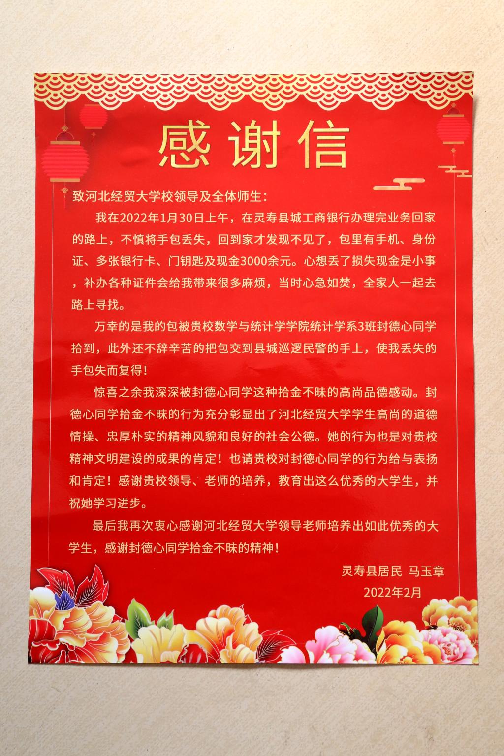 失主在感谢信中说,自己深深被封德心同学拾金不昧的高尚品德感动。封德心同学拾金不昧的行为,充分彰显了必赢国际437官网学生高尚的道德情操、忠厚朴实的精神风貌和良好的社会公德。