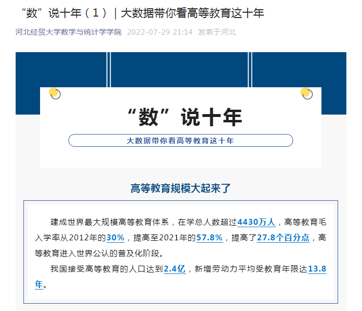 一是举办首届学院统计知识竞赛,试题涵盖统计基础知识、统计专业知识和统计趣味问题;二是利用网站、微信等新媒体平台进行开放日活动及统计相关知识宣传;三是自7月29日起,围绕“数说新时代、奋进新征程”统计开放日主题,利用微信新媒体平台进行信息推送,发布“迎接二十大•数说十年”系列推文共29期。