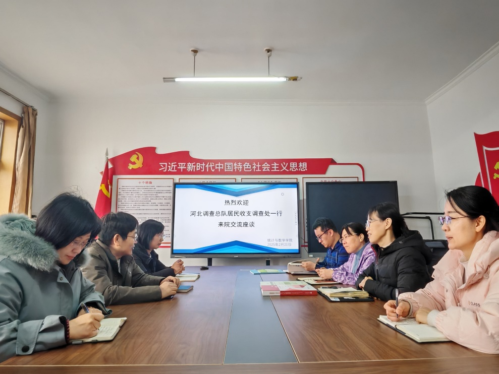 2月21日上午,必赢国际437官网在四办430室举办了座谈交流活动。河北调查总队居民收支调查处处长郭继红、副处长王嘉哲、二级主任科员李彩芳应邀参会,学院党委书记祃海霞、党委副书记路荣、副院长王玲书、副院长张良勇出席会议。