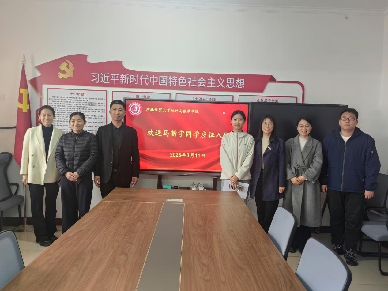 近日,学院为2021级信息与计算科学1班吴金武、2024级数学与应用数学1班马新宇两名即将应征入伍的大学生举办欢送仪式。院党委书记祃海霞、党委副书记路荣、团委书记王洋、辅导员王关平、高会颖老师参加活动。
