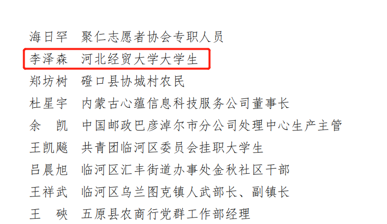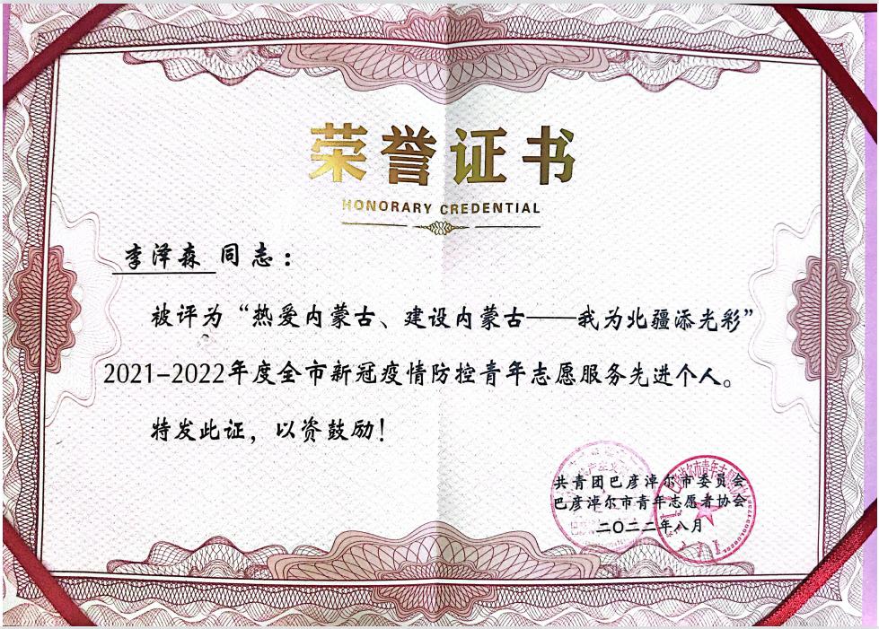2022年暑假,内蒙古巴彦淖尔市突发本土新冠肺炎疫情,一场疫情防控阻击战就此打响。必赢官网2021级统计学一班学生李泽森积极响应家乡疫情防控的号召,得知全员核酸检测消息后,在团市委的组织下主动向所在社区请缨,成为核酸检测志愿者。李泽森主要负责信息录入、秩序维护和入户统计查漏工作。他不畏任务艰巨,起早贪黑,全力投入疫情防控工作中,高标准、高效率、高质量完成了各项工作任务,总计工作时长40多天,服务时长315小时,服务居民3万人次,用实际行动诠释了抗疫志愿者的担当与责任。由于表现突出,被团市委、市青年志愿者协会授予“2021—2022年度新冠疫情防控青年志愿服务工作先进个人”荣誉称号。