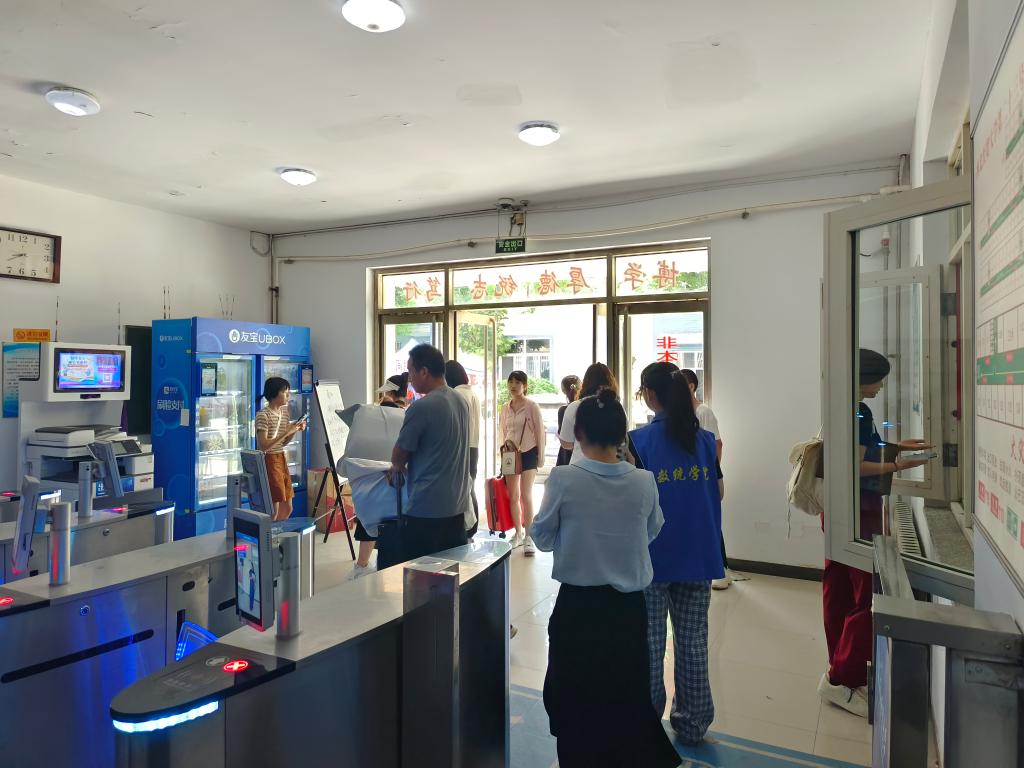 在新生宿舍楼下都有身穿学院标识蓝马甲的志愿者,他们穿行于人群之间,不断为新生与家长答疑解惑,帮助新生搬运行李的忙碌身影,成为了校园迎新一道亮丽的风景线。志愿者王奕飞说:“虽然帮助萌新们搬运行李有些累,但是能为他们提供力所能及的帮助,我们累并快乐着。”