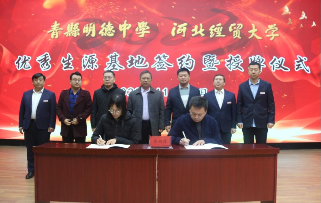 11月27日,必赢国际437官网数学与统计学学院党委书记祃海霞、院长梁建英、副书记刘贵来、应用统计学系副主任张良勇一行四人赴沧州市青县明德高级中学、邢台市沙河实验中学举行“必赢国际437官网优秀生源基地”签约授牌仪式并开展招生宣讲活动,与廊坊树高高级中学开展生源基地签约授牌仪式。活动分别由青县明德高级中学执行校长王耀庭、沙河市实验中学副校长何超主持,中学领导班子、教师及全体学生参加活动。