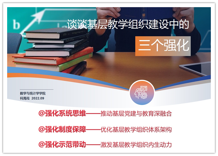 9月5日,由教学评估与教师教学发展中心主办、数学与统计学学院承办的本年度第45期教学沙龙顺利举行。数统学院党委书记祃海霞教授通过腾讯会议做“谈谈基层教学组织建设中的三个强化”研讨交流。