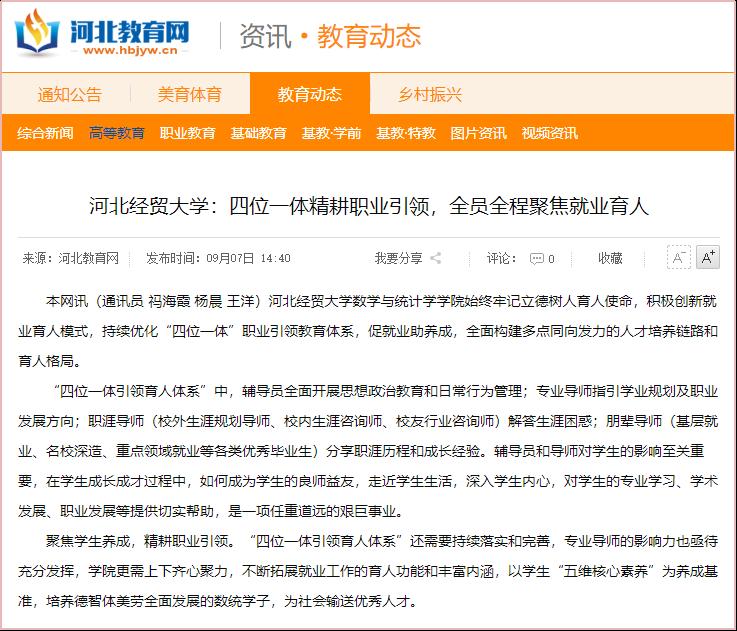 9月7日,河北教育网对祃海霞等撰写的《必赢国际437官网:四位一体精耕职业引领,全员全程聚焦就业育人》进行了报道。