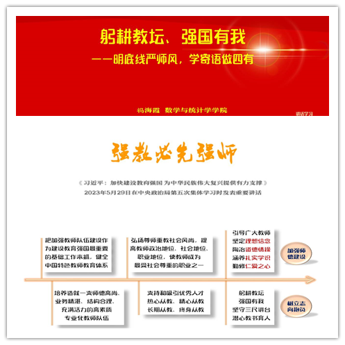 2023年6月8日,由教学评估与教师教学发展中心主办、数学与统计学学院承办的数统智汇(第39期)教学沙龙顺利举行。学院党委书记祃海霞依托学习通课程做“明底线严师风学寄语做四有”师德建设沙龙。