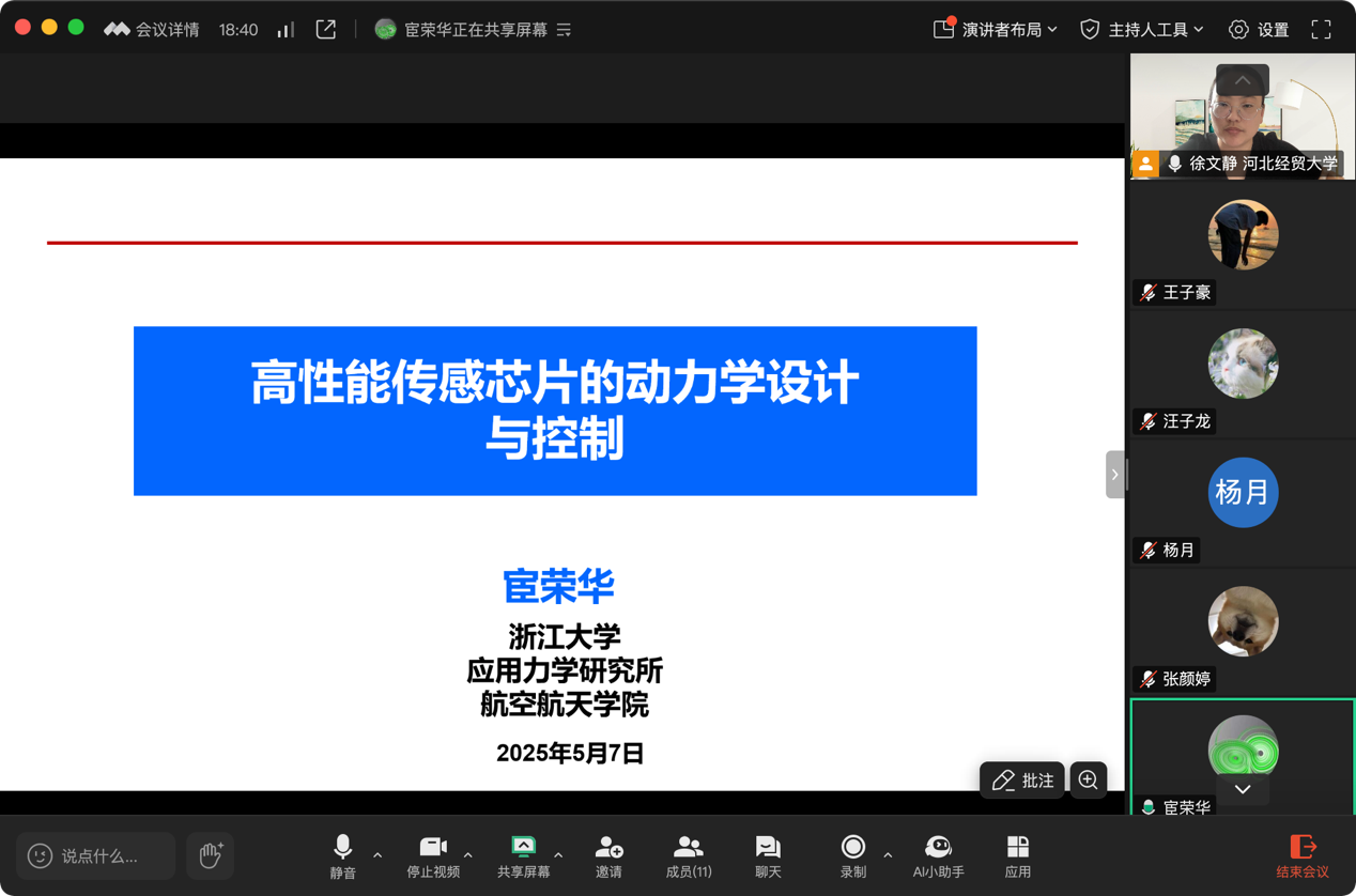 5月7日下午,浙江大学宦荣华教授应必赢国际437官网邀请在线上作题为“高性能传感芯片动力学设计与控制”的学术报告,相关专业师生20余人参会。